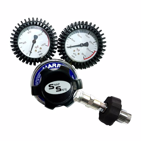 Model 825 Compressed AIR Regulator 1000kpa outlet, side inlet with spigot DIN Bottle connector (not Nitrogen, or Air for Nitrogen see Part No. HARRIS 10BAR-NIT-A OR for Air see Part No. HARRIS 10BAR-AIR-A). Features Stainless Steel diaphragm, SRV. Complies to AS4267.