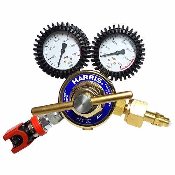 Model 825 Compressed AIR Regulator 4000kpa outlet, side inlet with spigot for Compressed Air bottle use (not Nitrogen, for Nitrogen see Part No. HARRIS 40BAR-NIT). Features Stainless Steel diaphragm, SRV. Complies to AS4267.
