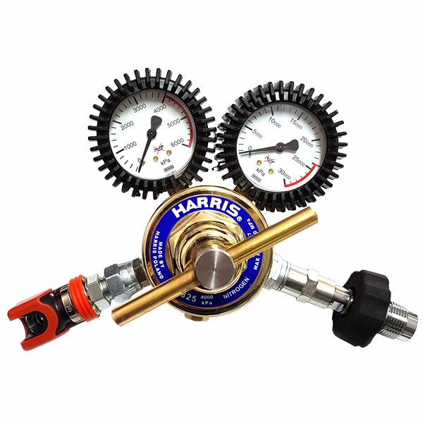 Model 825 Compressed AIR Regulator 4000kpa outlet, side inlet with spigot DIN Bottle connector (not Nitrogen, or Air for Nitrogen see Part No. HARRIS 40BAR-NIT-A OR for Air see Part No. HARRIS 40BAR-AIR-A). Features Stainless Steel diaphragm, SRV. Complies to AS4267.