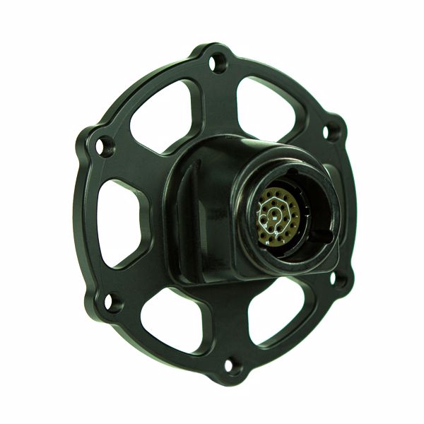 Male boss with 6 hole mount and 22 pin Deutsch electrical connector to fit onto steering column for QR-03 Series Steering Coupler. This part fits into the opposing QR-30-22P or QR-30 female half of the quick release coupling.