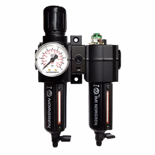 Norgren 1/2" BSP Professional Metal Bowl Filter, Pressure Regulator, Lubricator (FRL) Assembly complete with MANUAL DRAIN, pressure gauge and quick fit wall mounting bracket.